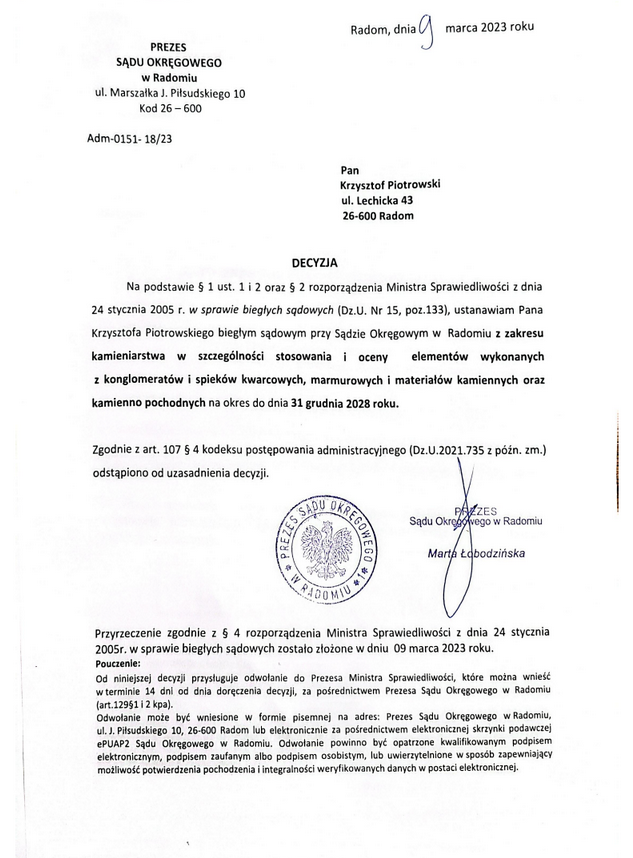 Biegły Sądowy przy Sądzie Okręgowym w Radomiu